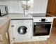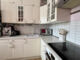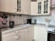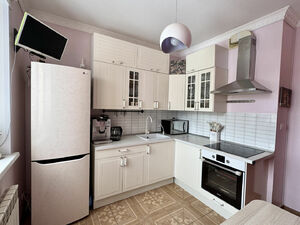 Кухня 9.8 м² с большой рабочей зоной и единой пластиковой столешницей. Качественный мебельный гарнитур с обеденной зоной и импортной техникой: электрическая плита, духовка, вытяжка, фильтр очистки воды Аквафор и стиральная машина остаются покупателю.